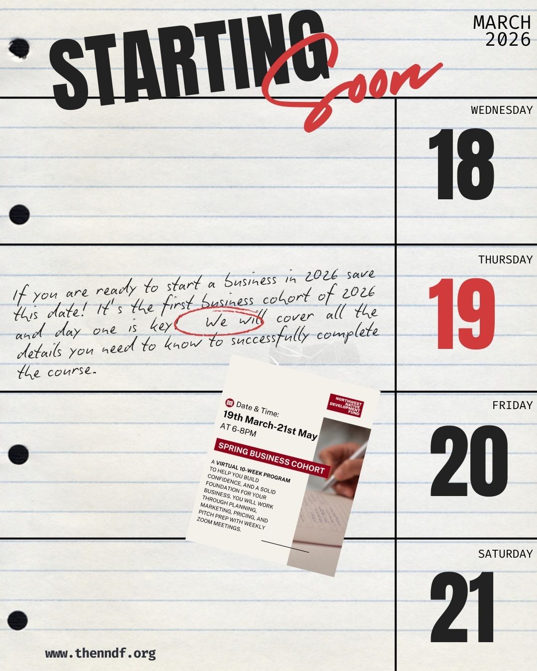 March 19-May 21, 2026 Free Virtual Cohort Series If you are thinking of starting a business, mark your calendar for the upcoming Bridges to Prosperity Business Cohort with Roxanne Best. We will meet virtually over 10 weeks and cover the foundation of what you need to include in your business plan. Participants meet virtually via zoom from…