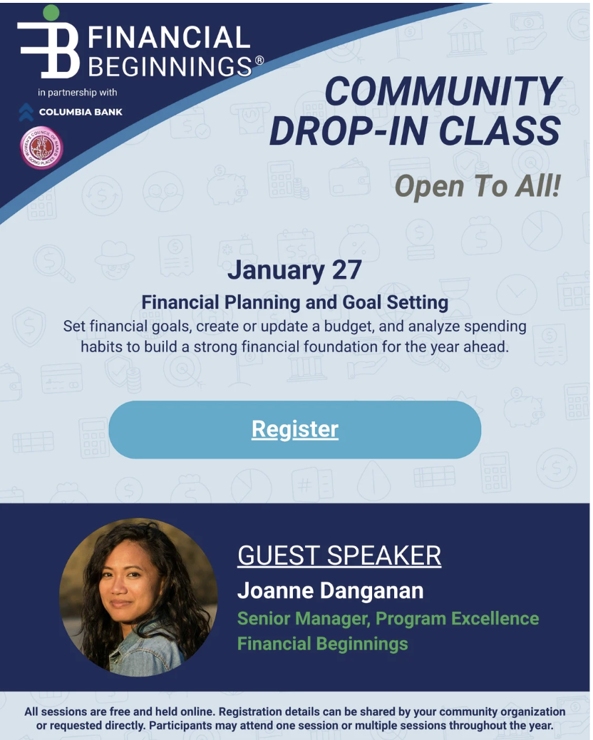 Tuesdays, January 27, 2026 @ 12 PM PST Free Virtual Class Start the new year with intention and clarity. In this session, we’ll focus on setting realistic financial goals, creating or updating a budget, and learning strategies to track spending and build healthy habits throughout the year with Guest Speaker Joanne Danganan, Financial Beginnings.