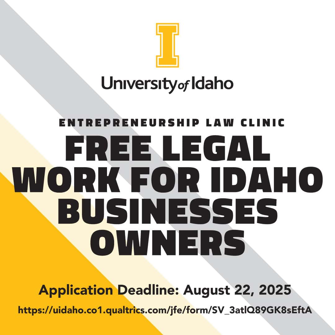 Application Deadline: August 22, 2025 Law students in the Entrepreneurship Law Clinic ("ELC"), supervised by a licensed attorney, provide free legal work to Idaho business owners. The ELC can help with a wide variety of business-related legal work, including forming a legal entity such as an LLC or corporation, drafting or reviewing contracts, filing trademark applications, or…