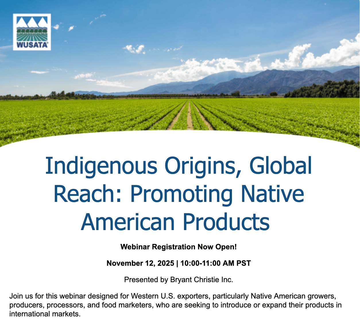 November 12, 2025 | 10:00-11:00 AM PST Free Virtual Webinar Join us for this webinar designed for Western U.S. exporters, particularly Native American growers, producers, processors, and food marketers, who are seeking to introduce or expand their products in international markets.