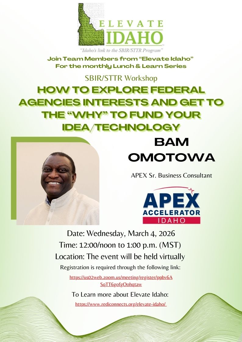 March 4, 2026 | 11 AM PST Free Online Elevate Idaho helps early-stage Innovators compete for federal research and development funds through the Small Business Innovation Research (SBIR) and Small…