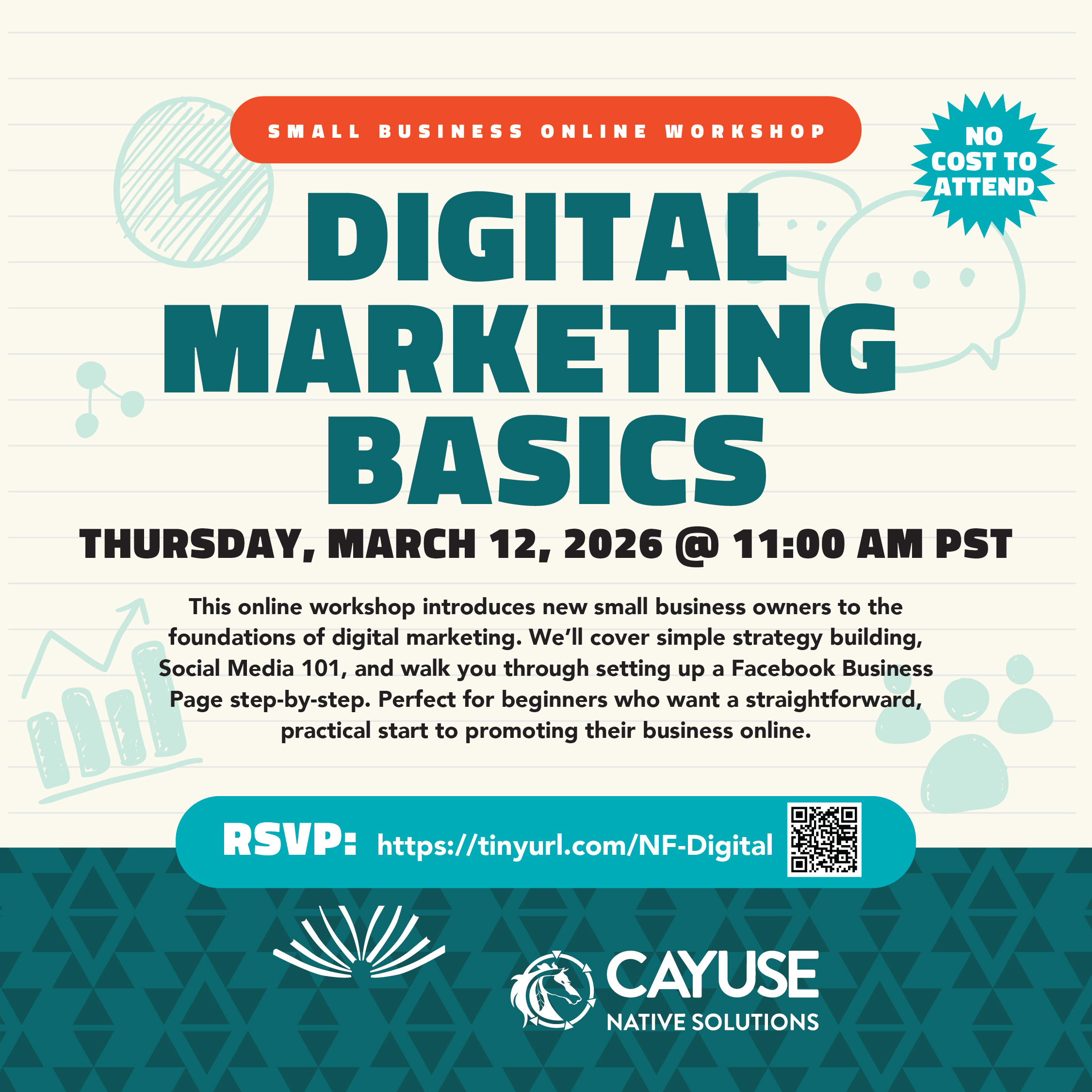 FeaturedThursday, March 12, 2026 @ 11 AM PST Join Nimiipuu Fund and Jiselle Halfmoon, Cayuse Native Solutions, for this online workshop introduces new small business owners to the foundations of…
