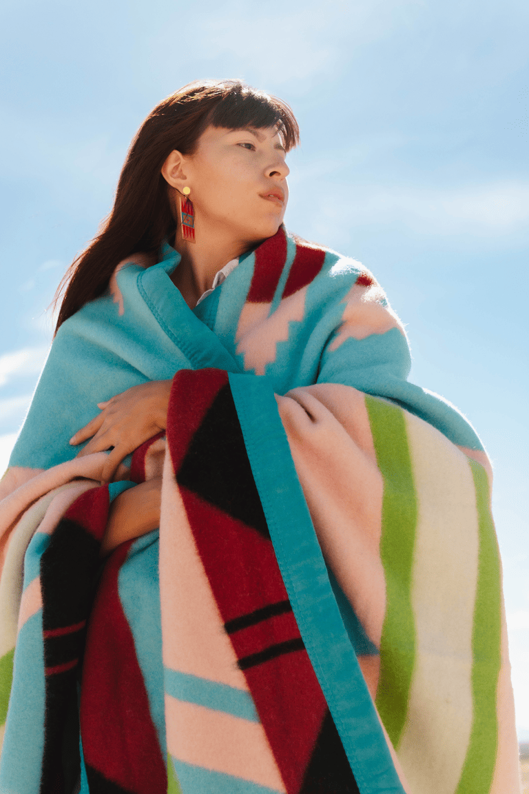 Blue for our homeland’s rivers. Red for the blood of our warriors. Old-style pink that was traditionally only acquired through trade with neighboring tribes. nimíipuu (Nez Perce) artist Mikailah Thompson…